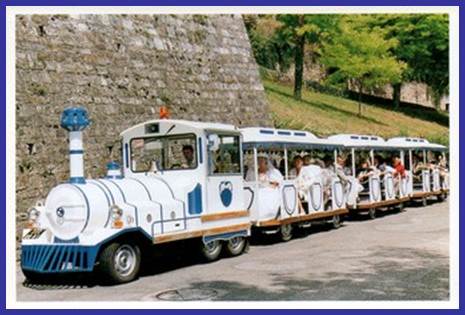 Le petit train traversant le parc et devant les remparts de Cordes-sur-Ciel