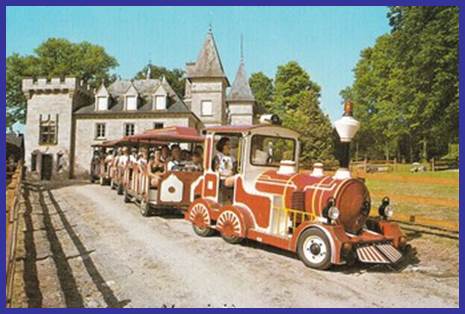 Le petit train devant le château de l'île de Vassivière et sortant du pont