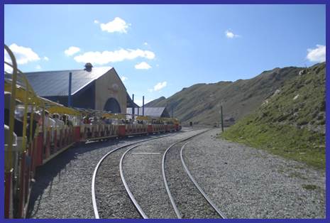 petit train arrivant en gare du lac d'Artouste et rames en attente de départ